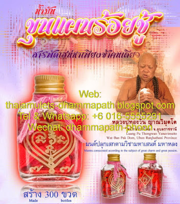 Special: This is Efficacious of Naman Khun Paen Roy Chu 'Sarapad Saneha PheiYa KhongDew' Nur Charming Oil (height 7cm) strongly blessed by LP Thongwan and Top Monks in year BE2568 with Khmer Charm Spell. This sacred Bottle Naman Khun Paen Roy Chu is made from sacred Charming Herb Oil materials for total made 300pcs only. Featured with sacred Holy Wooden Salika, Flower Dok, sacred Mahasaney Takrut and the Charming Oil bottle. Additional with sacred Bound Holy Rope and Hand Write Yants on surface bottle. I highly recommend to you. Supplied with temple pack.