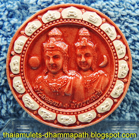 This Powerful Twin Jatukham Ramathep Nur Kerb With Shadow Chedi & Phra Rahu, strongly blessed by Top Monks in Grand Ceremony at Wat Mahathat in year BE2550. Featured finest Twin Jatukham RamaThep images and sacred Yant at front. Additional with image of 'Shadow Chedi' and Phra Rahu image with sacred Yant & 12 Animals Zodiac at back. This Jatukham RamaThep is made from sacred Holy powder materials with added Kerb colours at both side of (Green-Red-Black) and Code at side.