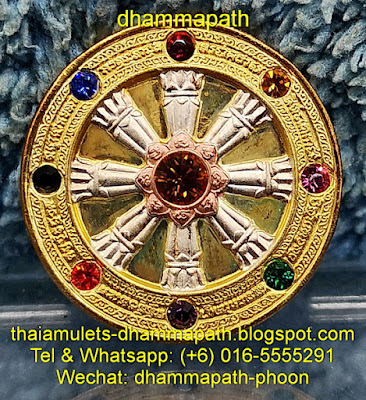 Special: This is sacred 3K Rian DhammaChakra Wheel Nur Bronze Samkasat (height 2.8cm) strongly blessed by LP Namfon in year BE2549 at Wat Pailom with mass chanted and led by LP NamFon, who's the successor of LP Poon. This sacred 3K DhammaChakra Wheel is made from sacred Bronze materials and coated golden-silver-copper on surface. Additional with added Gemstones at front
