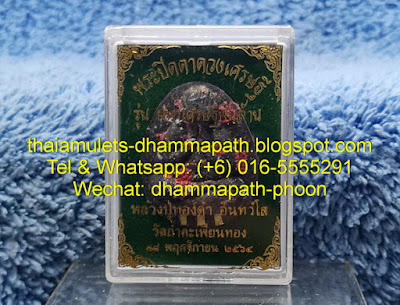 Special: This is Superb Phra Pidta Mahasetthi Panlan + 3 Gold Takruts Nur NgioDam (Height 3.1cm) strongly blessed by LP ThongDam in year BE2564 for temple restoration funds. This sacred Phra Pidta is embedded 3 Gold Takruts, added LP ThongDam's hair and Kassa Jivorn at front. Additional with sacred Yant, Rae Gems, name details with Chop Yant Code and series number at back. This sacred Phra Pidta is made from mixed sacred NgioDam materials + Kassa Jivorn LP ThongDam (BE2523 blessed by LP Toh) and Kassa Jivorn LP Kuay (BE2543 blessed by LP Moon) and total made 999pcs only. Supplied with temple box. I highly recommend to you.